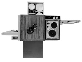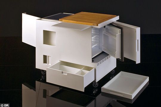 Tout sous la main et un encombrement minimum avec cette kitchenette sur roulettes au look très contemporain et pourtant créée en 1963 par Joe Colombo, designer Italien.