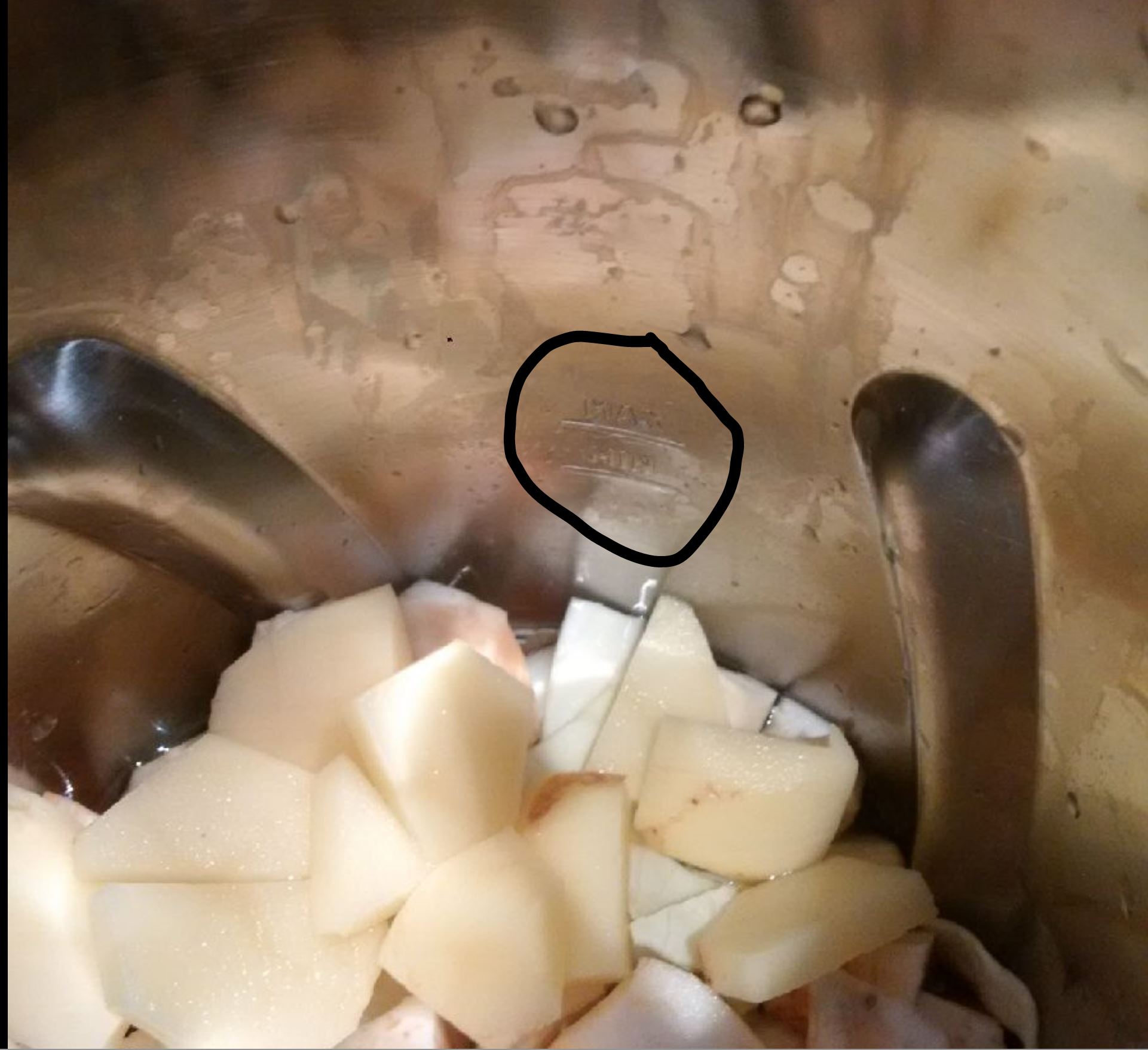 De l’extérieur, on ne voit pas ceci mais quand on apprend qu’il ne faut pas mettre d’aliments ou d’eau AU-DESSUS de la marque intérieure qui arrive à la moitié du pot .. on comprend vite qu’on va devoir manger du pain avec la soupe 🙂